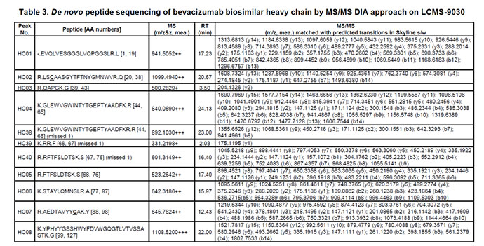 岛津分析bevacizumab 生物类似药序列分析,通过Shim-pack GISS-HP色谱柱(3um,150*3.0 mm),可以高效分离酶切后的轻重链肽段,最后用LC-MS 9030 进行一级和二级扫描,优化的参数色谱质谱参数如下表所示。