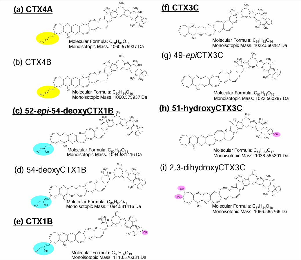 雪卡毒素(也称西加毒素)中毒是由雪卡毒素(CTXs)引起的,是世界上常见的食物中毒来源之一,据调查,CTXs每年大约造成5万人中毒,是造成人类中毒分布广、人数多的一种海洋毒素之一。目前发现CTX的类似物有30余个。
