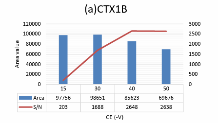 但是,[M+Na]+和[M+Li]+母离子没有提供任何有用的产物离子,因此优化CE用以监测[M+Na]+>[M+Na]+或[M+Li]+>[M+Li]+在MRM分析模式下提供高的信噪比。CTX1B的优化CE如下表所示。其余8种类似物的佳CE以类似的方式进行了优化。
