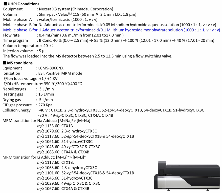 根据岛津新发布的一项技术,通过向流动相中添加非常少量的碱金属(如Na+和Li+)来优化一种使用钠和锂加合物[M+Na]+和[M+Li]+离子检测CTXs的高灵敏度方法。通过这项技术,可以使用LCMSMS成功分离及检测FDA推荐的低浓度的CTXs。本文介绍了[M+Li]+新方法的分析条件和准确度。