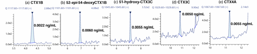 使用JFRL标准品生成校准曲线,以确认[M+Li]+> [M+Li]+ 。校准曲线低点的每个色谱图如下图所示。确定校准曲线的范围,使每个校准点的3次重复分析的平均准确度为100±5%,并指定低点作为 LOQ。用5 g鱼肉制备1 mL测定溶液时,5种标准品的LOQ范围为0.0004至0.0012μg/kg。