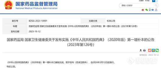 10月12日,国家药监局发布公告,《中国药典》2020年版第一增补本已编制完成,将于明年3月12日正式实施。