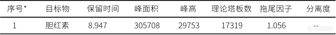 结果显示,胆红素峰形良好,理论塔板数大于5000,满足人参再造丸、牛黄降压胶囊、牛黄降压丸标准要求,可为含牛黄和人工牛黄处方的中成药“胆红素”项目提供参考。