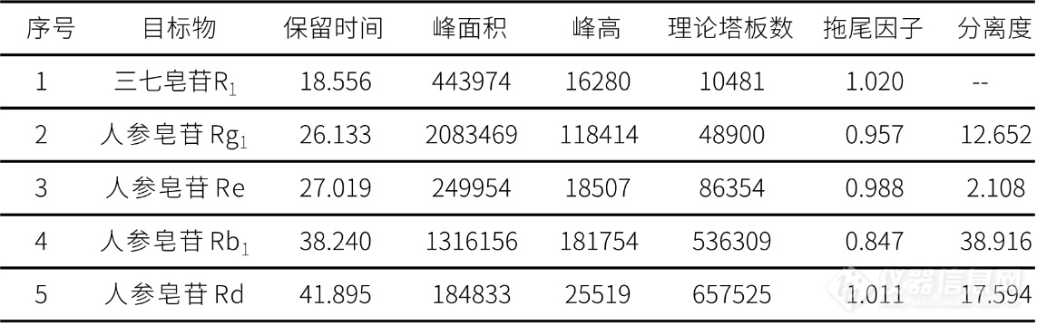 结果显示,人参皂苷 Rg1与人参皂苷 Re的分离度大于2.0(第一增补本三七总皂苷及血塞通、血栓通系列品种要求大于1.8),理论塔板数按人参皂苷大于48000(第一增补本三七总皂苷及血塞通、血栓通系列品种要求大于6000),技术指标满足第一增补本标准要求,可为相关制剂含量测定提供参考。