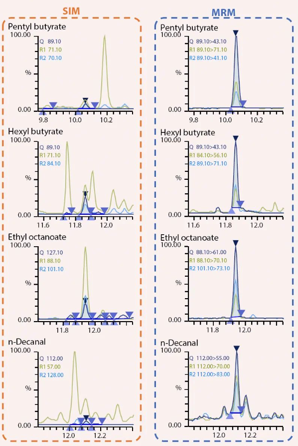 产品最终的香气受各香气化合物之间平衡的影响,因此香气化合物定量分析的准确性尤为重要。然而唇彩等化妆品及其他护肤品通常含有从植物或其它来源提取的天然香味物质或活性成分,因此这些目标组分附近常伴随着多个干扰峰,即使采用SIM模式有时也不能很好的区分,给精确定量目标化合物带来挑战。在这种情况下,MRM模式分析的高选择性可以帮助尽可能的减少干扰物的影响,从而获得更准确的香气化合物定量结果、减少数据分析工作量。香味物质数据库预置已优化好SIM和MRM模式分析条件,利用岛津特有的AART保留时间自动调整功能无需标准品即可自动创建SIM或MRM方法。下图2是使用香味数据库获得的SIM和MRM模式分析结果的比较,从图中可以看出,SIM模式分析目标组分附近存在大量干扰峰,而MRM模式分析可以有效的排除杂质或其它污染物的干扰,获得更准确的定性、定量结果,提高分析效率。此外,香味数据库还可以通过指定内标的校正分析,提供非常有用的半定量信息,对产品的香气研究提供参考。