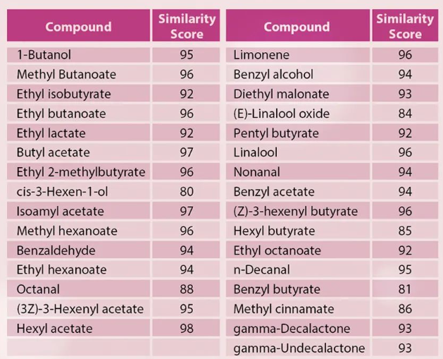 本应用利用岛津专业的香味物质数据库对唇彩样品进行了多种分析模式的检测,共鉴定出31种重要的香气化合物,更通过质谱相似度得分缩小化合物候选列表、通过MRM模式排除干扰,从而有助干提高香气化合物定性和定量分析的准确率和效率。