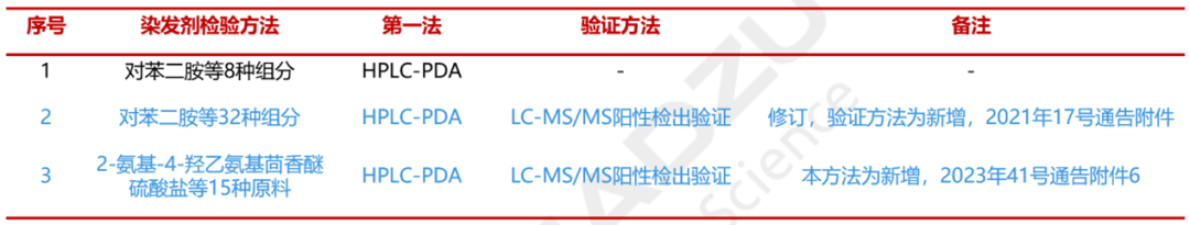 在《技术规范》及后续修订中染发剂相关的理化检验项目如下:
