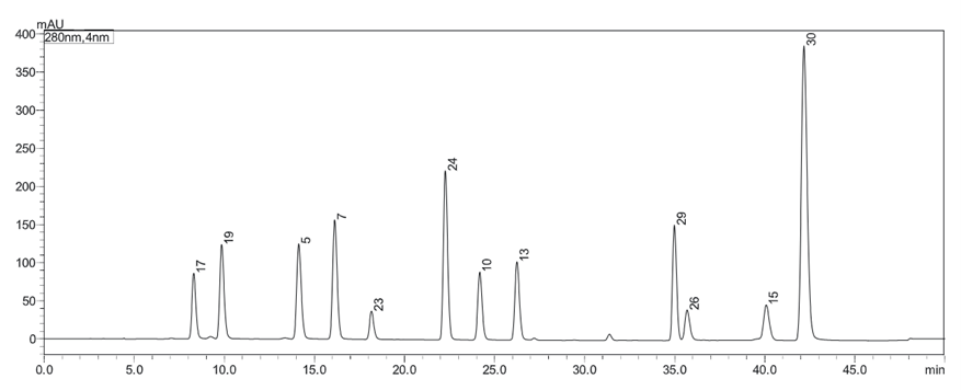 从左至右依次为,17:m-苯二胺;19:氢醌;5:o-氨基苯酚;23:p-甲基氨基苯酚硫酸盐;24:4-硝基-o-苯二胺;10:甲苯-3,4-二胺;13:6-氨基-m-甲酚;29:2,7-萘二酚;26:N,N-二乙基-p-苯二胺硫酸盐;15:N,N-二乙基甲苯-2,5-二胺HCl;30:N-苯基-p-苯二胺