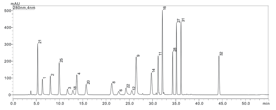 参照国家药监局发布的2021年17号通告中附件4的方法,采用岛津特色LC-40双进样液相分析系统分析化妆品中对苯二胺等32种染发剂含量。2021年17号通告中附件4表示“32种组分未在同一液相条件下分离,在参考液相条件2中,这些组分在第一组和第二组的液相条件下的分离图谱和出峰时间如图A.1和图A.2所示。在第一组的条件下,有10个组分未完全分离,分别为2,6-二氨基吡啶(R25)和间苯二胺(R17)、邻氨基苯酚(R7)和间苯二酚(R8)、对甲基氨基苯酚硫酸盐(R23)和N,N-双(2-羟乙基)对苯二胺硫酸盐(R22)、甲苯-3,4-二胺(R10)和4-硝基邻苯二胺(R24)、1,5-萘二酚(R31)和2,7-萘二酚(R29)。其中,除邻氨基苯酚(R7)和间苯二酚(R8)需要用液质确证外,其余八个组分均可用第二组液相条件完全分离。“
